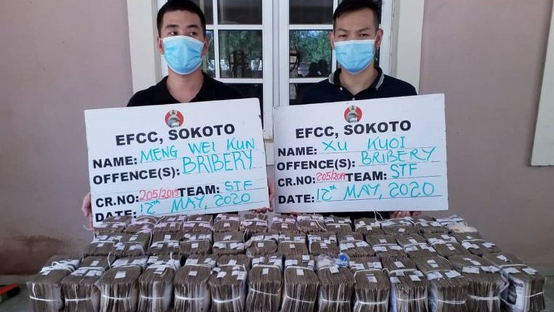 Head of the EFCC's Sokoto zonal office, Abdullahi Lawal, said Meng Wei Kun and Xu Kuoi of China Zhounghao Nigeria Limited, a construction company, tried to bribe him and his team to stop an investigation into the company's operations.The two were arrested on Monday, May 11, 2020 after paying half of the promised N100 million bribe.