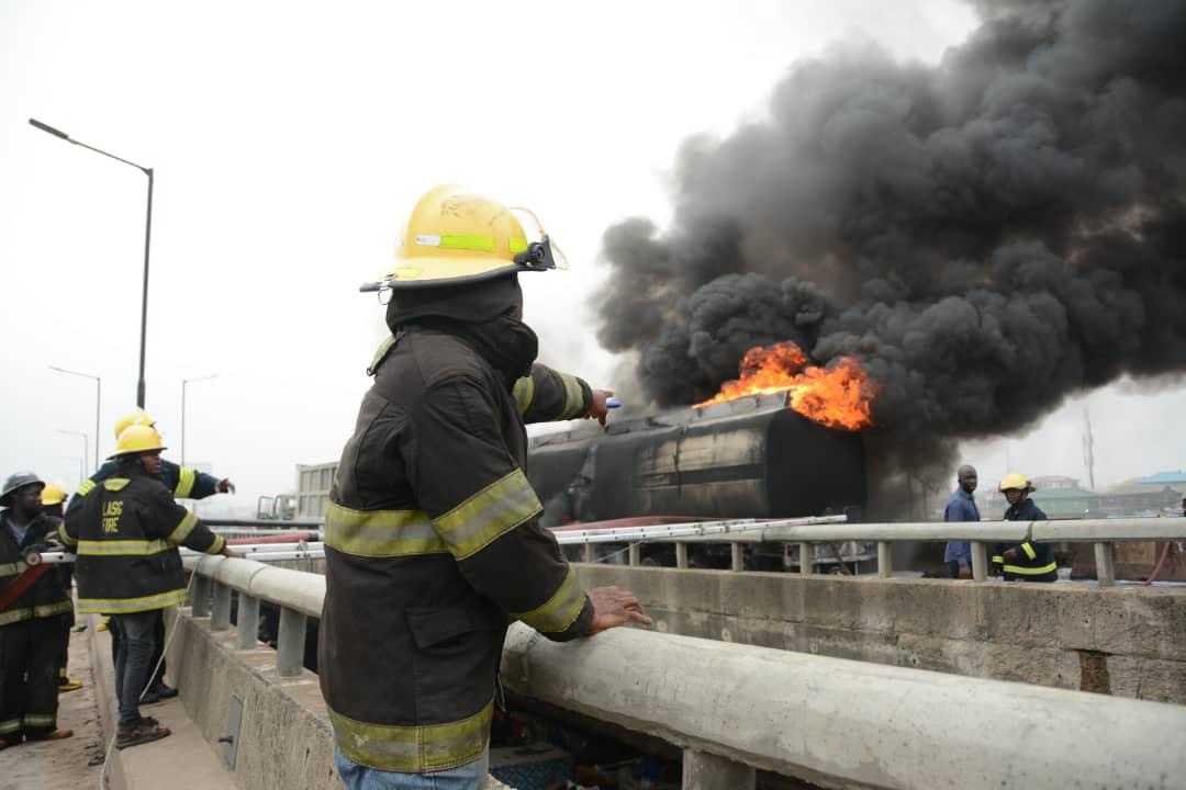 Men of the Federal and Lagos State Fire Service arrived the scene swiftly to douse the flames, a task which has continued for hours, thereby causing heavy traffic jam on both sides of the Lagos-Ibadan Expressway.