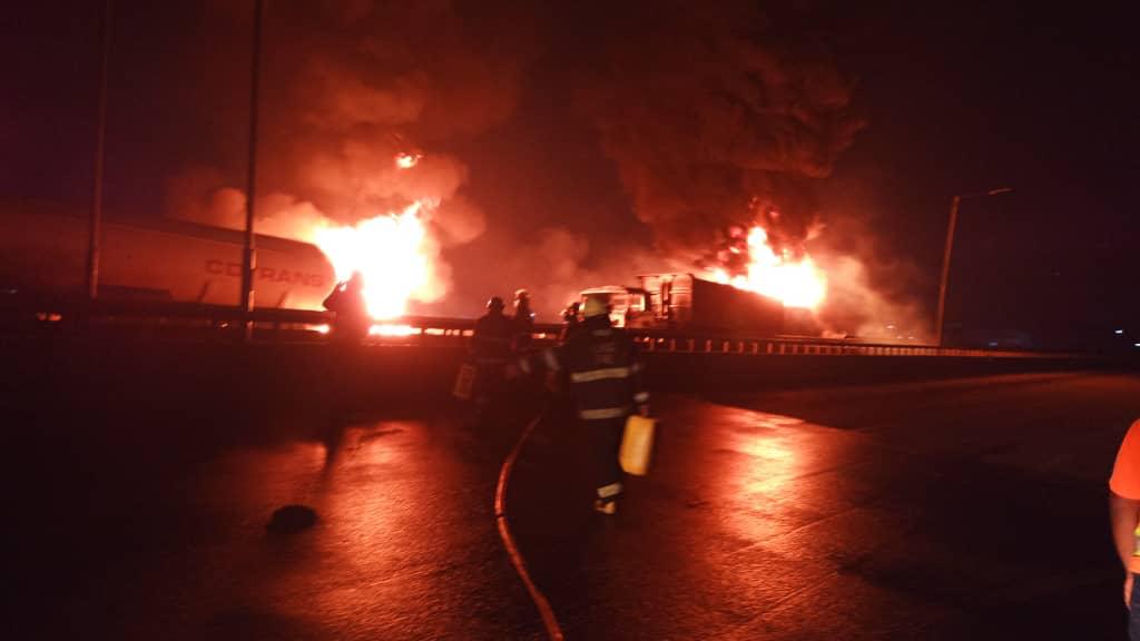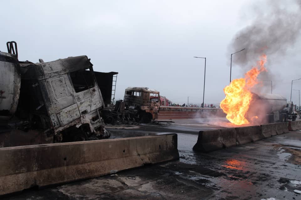 Some parts of Kara Bridge, has been affected by an explosion, after an articulated truck laden with 33,000litres of PMS crashed into another Cement Transport truck at Kara Bridge, while driving inward the Lagos-Ibadan Expressway.