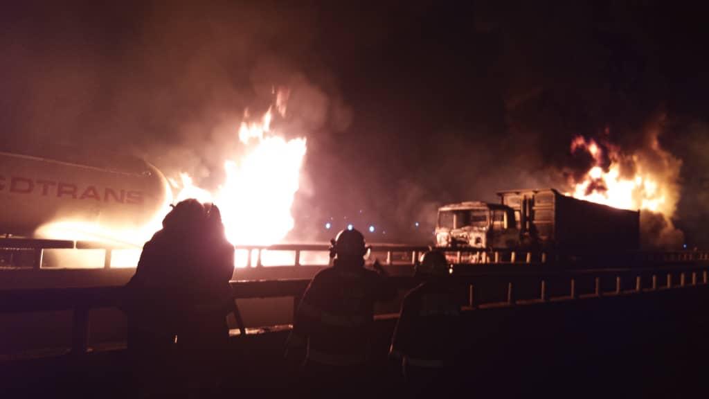 The impact of the crash resulted to widespread of fire, three trucks were destroyed, and one person has been confirmed dead.