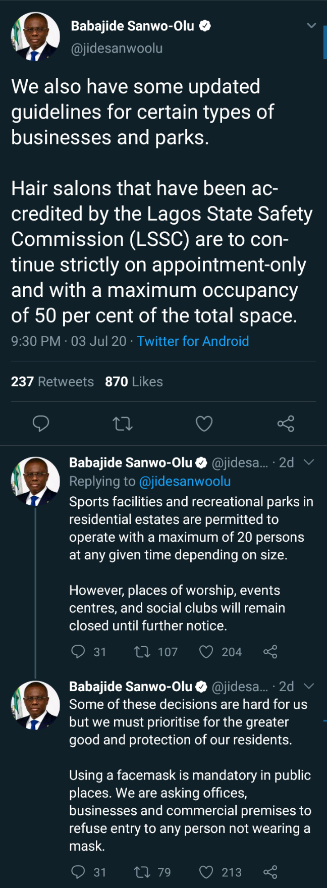 Hair salons that have been accredited by the Lagos State Safety Commission (LSSC) are to continue strictly on an appointment only and with a maximum occupancy of 50 percent of the total space."